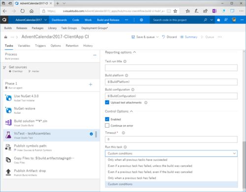 はじめに ビルド定義での条件設定 Custom Conditionの設定 参考文献 はじめに これはVisual Studio Team Servicesアドベントカレンダー17日目の記事です。 qiita.com ビルドタスクを定義してもちょっと特定の時は動いてほしくない、という場合はあります。例…